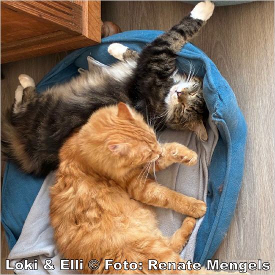 Wir sind die Geschwister Kater Loki und Katze Elli und Maine Coon Mischlinge.Wir sind dreieinhalb Jahre alt und müssen schweren Herzens in ein neues Zuhause umziehen, da unsere Katzenmama unser Heim aufgeben muss und sie uns in ihr neues Zuhause nicht mitnehmen darf. Den Freigang in unserer ruhigen, ländlichen Umgebung genießen wir bei jedem Wetter. Aber wir sind Fremden gegenüber sehr scheu und mögen keine lauten Geräusche oder kleine Kinder. Unsere neuen Lieblingsmenschen müssen daher viel Geduld aufbringen, um unser Vertrauen zu gewinnen. Wenn wir sie dann in unsere Katzenherzen geschlossen haben, sind wir sehr anhänglich und lieben es, wenn wir bei der Fellpflege gebürstet und gleichzeitig beschmust werden.