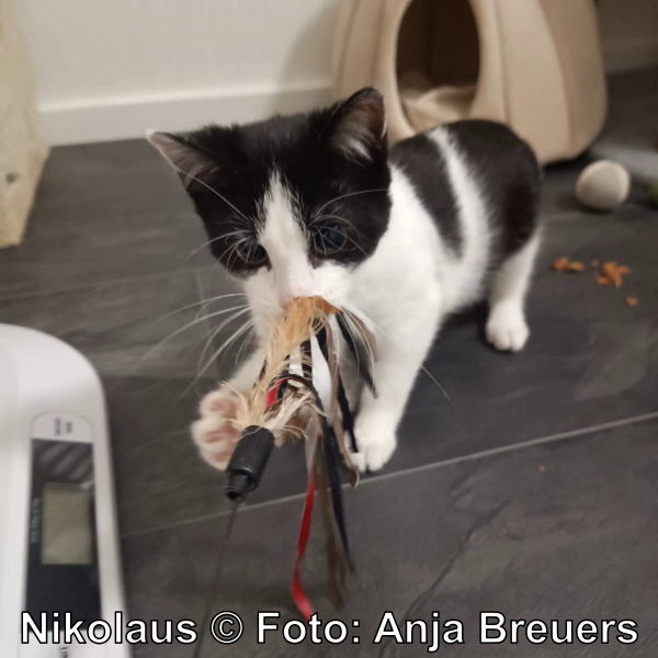 Nikolaus (Niko) ist ein Katerchen, geboren im Juli 2025. Seine Mutter wurde vom ehemaligen Besitzer an einen Bekannten abgegeben und nicht mehr abgeholt. Dort wurde die schwangere Katzendame Mutter von zwei Babies. So kamen die drei auf unsere Pflegestelle, wo sie liebevoll versorgt wurden. Die Mutter und das Geschwisterchen fanden schnell ein für immer Hause, nur Niko blieb allein zurück. Das ging ja gar nicht.