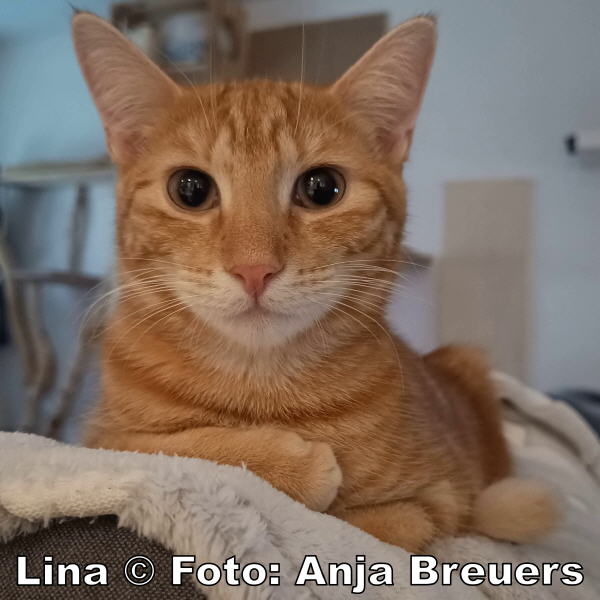 Lina (ca. 8 Monate) ist eine kleine süße Kuschelmaus. Sie wurde von einer halbwilden Mutter in Freiheit geboren und kam zusammen mit ihren Brüdern auf unsere Pflegestelle. Das zarte Katzenmädchen ist sehr lieb, lässt sich gern auf den Arm nehmen, fordert ihre Streicheleinheiten ein und verteilt Küsschen. Natürlich muss sie sich erst an ihre neuen Menschen gewöhnen. Ihre anfängliche Schüchternheit verliert sie aber sehr schnell. Ganz ihrem Alter entsprechend schaltet sie auch flott um in den Spielemodus. Toben, Blödsinn machen und Neues entdecken gehören zu ihrem Tag natürlich dazu.